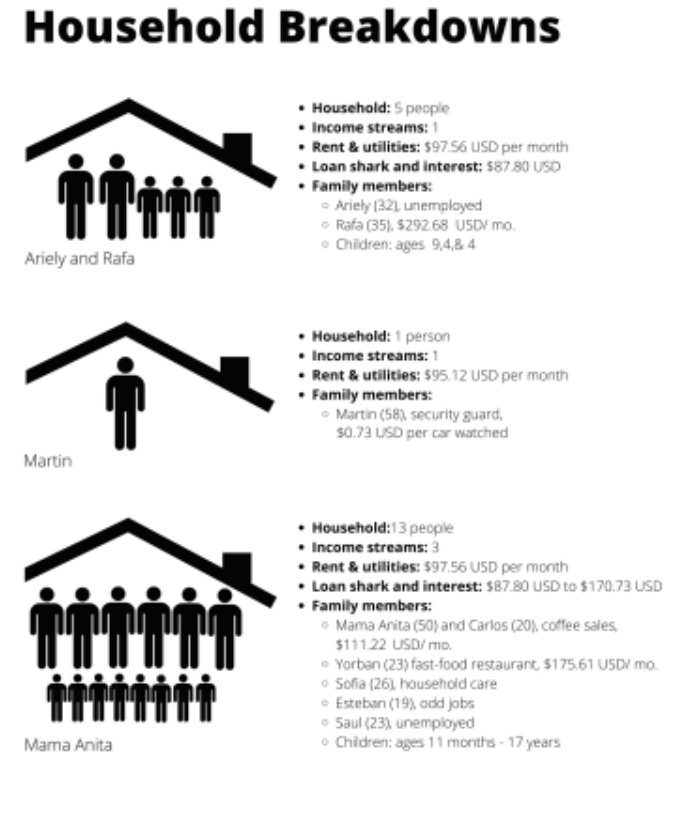 Household 2: Right below Ariely and Rafa’s apartment, Mamá Anita heads up a household of thirteen: six adults and seven children. With more people comes more income streams, but also much higher costs, particularly food and school costs for the seven children. Mamá Anita and one of Ariely’s adult brothers, Carlos, sell coffee on the street, making about $7 USD in sales per day between the two of them. Of that, $2.70 USD is invested into their product inventory, leaving them with a daily profit of $4.50 USD. Yorban, one of Ariely’s brothers-in-law, works at a fast-food stand, earning $7 USD per day in wages. Of the other three adult family members, 26-year-old Sofia heads up making meals and caring for household needs and 19-year-old Esteban pitches in on household costs if he can. Twenty-three-year-old Saul has Down Syndrome and tends to remain at home. This household earns around $239 USD per month (Coffee: $4.60 profit x 20 working days = $92; Fast food: $7.30 wages x 20 working days = $146).