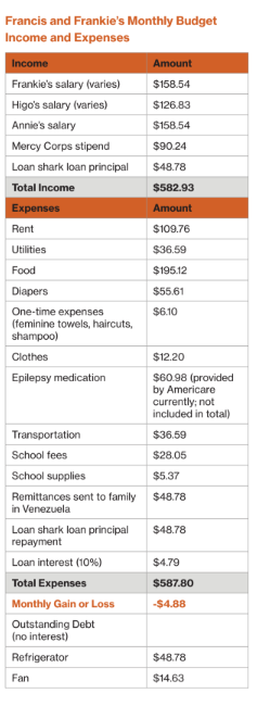 Frankie and Francis acknowledge that they have no idea how they survive on the income they have. Their expenses largely exceed their income. They buy food on credit from food vendors regularly, up to $24 USD per month, but they still have to skip meals sometimes. They do not have any clothes but the ones they brought from Venezuela. On top of everything, Frankie and Francis are sending $49 USD every month to their parents and other family members still in Venezuela. They have come to rely on loans from loan sharks, with exorbitant interest of $5 USD per day. Coping as they are with daily scarcity and the predatory interest rates of loan sharks, saving is impossible. Looking down at the long list of expenses that she and her husband Frankie face, Francis tells me, “The phrase ‘Where one eats, we all eat’ is dead.”
