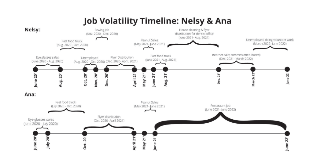 As for Nelsy, she’s continued to jump between short-term jobs over the past year. She did house cleaning and distributed flyers for a dental clinic, sold fried plantains at a local fast-food truck (until it closed), and then did commission-based internet sales. The problem with the last job was that if she didn’t make a minimum number of sales, she didn’t get paid at all.
